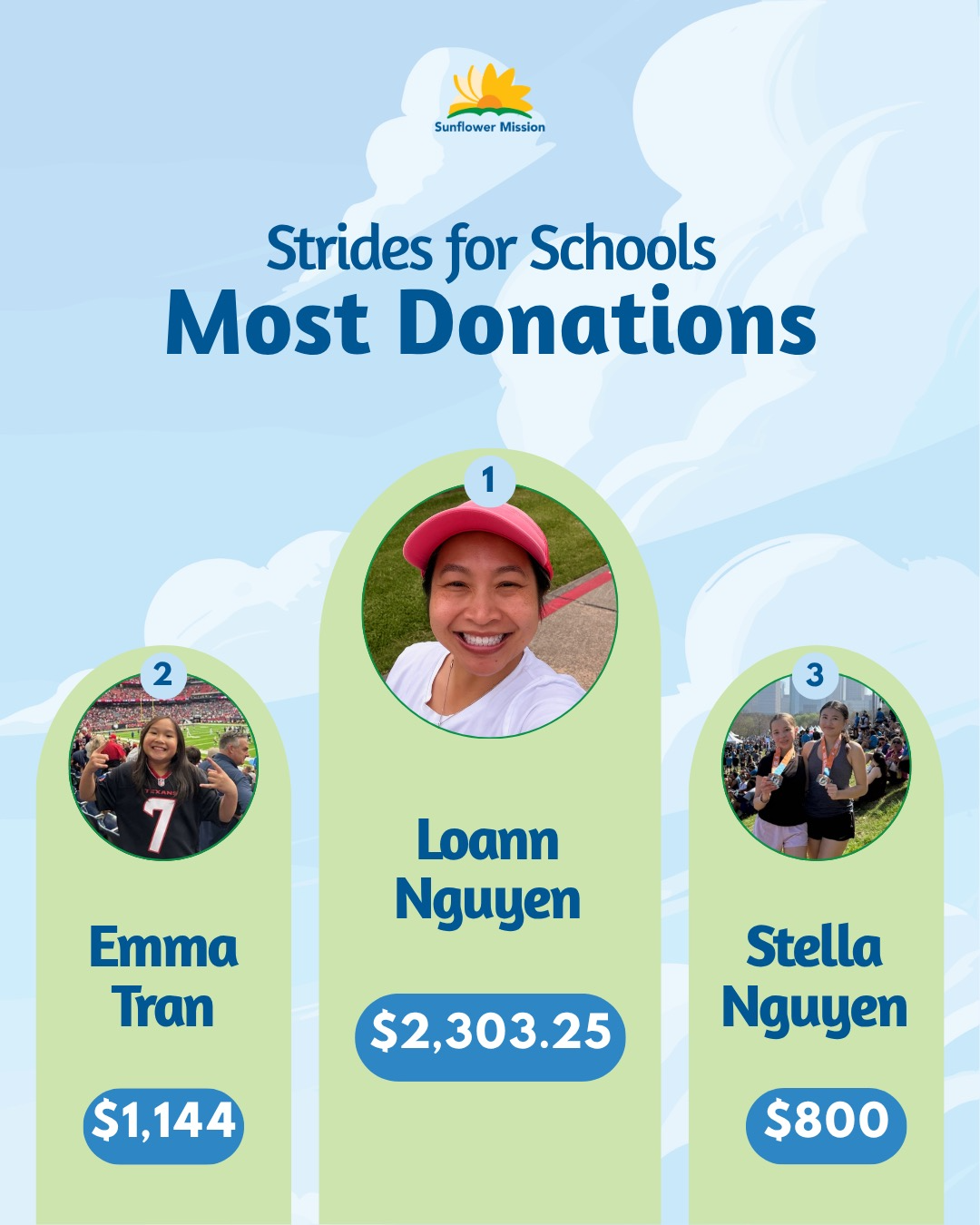 On the fundraising side, Loann Nguyen stood out with an outstanding $2,303.25 raised from 20 donors.