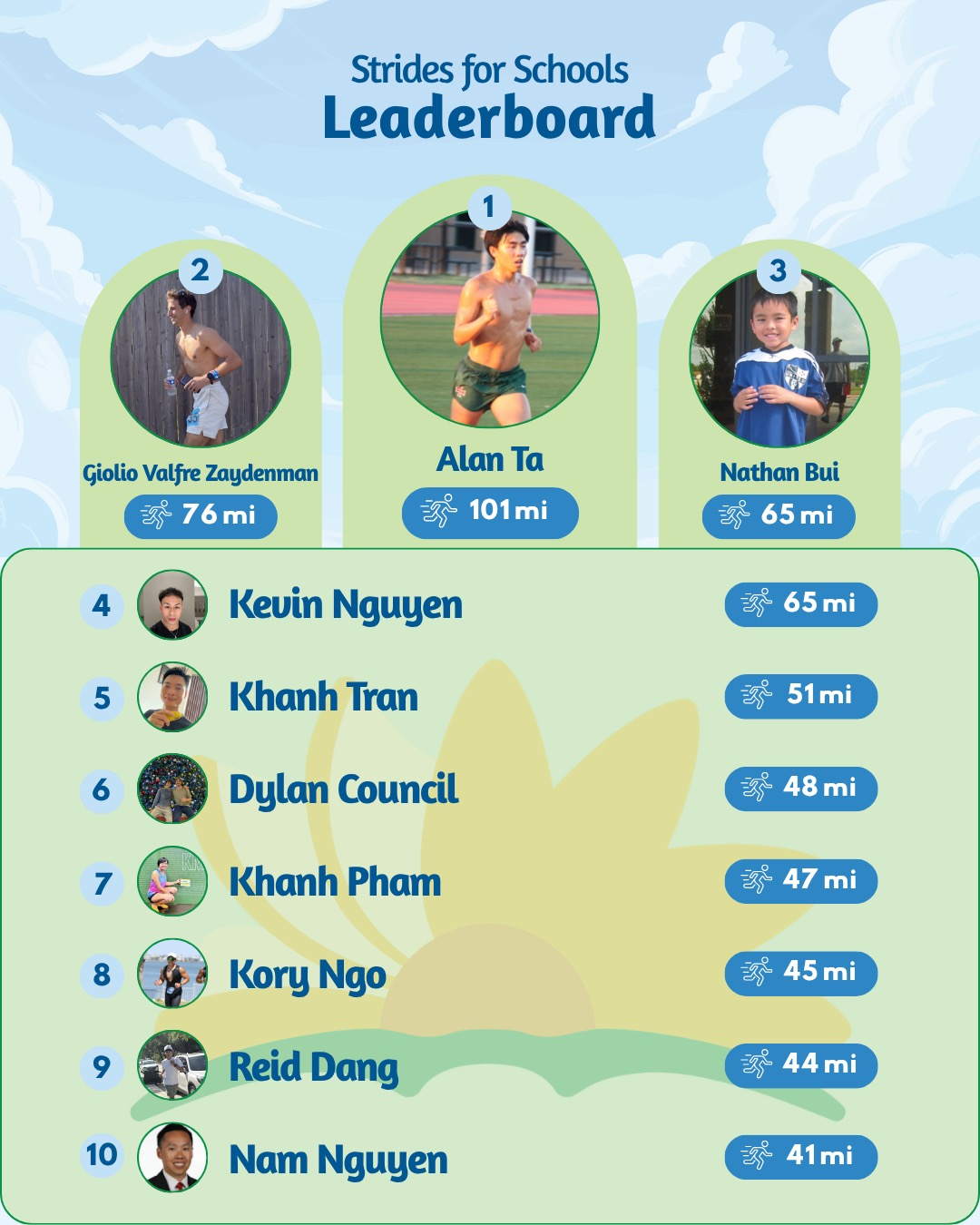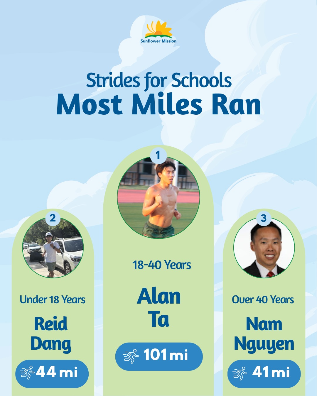Across age groups, Reid Dang topped the under-18 division with 44 miles. Alan Ta also led the 18–40 category, continuing his dominant run, while Nam Nguyen took first in the 40+ group.